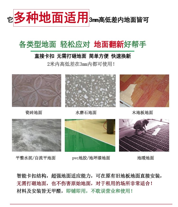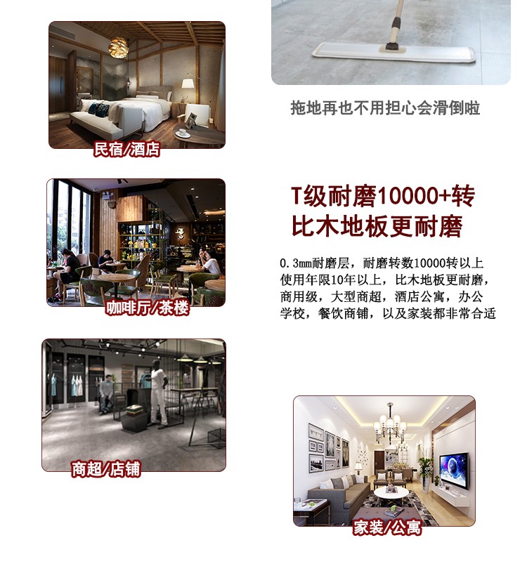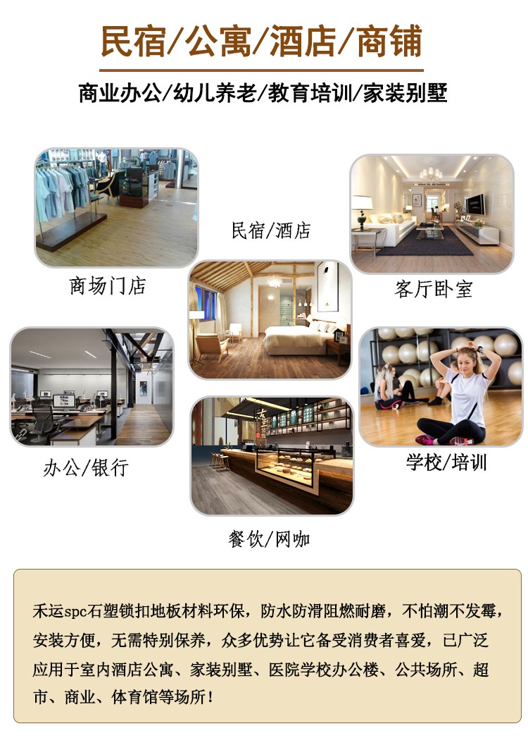 介紹:spc鎖扣石塑地板,是由鈣粉、聚氯乙烯穩定劑組合的一定比例混合形成復合地鋪材料。是現在非常流行的一種無醛環保地板,極為穩定、高性能、完全防水、高密度銷售芯、耐壓痕;它可以很容易地安裝在不同類型的地面基地,混凝土,陶瓷或現有的地板,非常適合用于舊地面改造,老舊瓷磚木地板地毯等地面翻新使用。安裝快速簡單,材料環保無味,即鋪即用。是響應國家減排而發明的新型材料,是100%不含甲醛的環保地板,是真正的0甲醛地板。因其厚度薄、花色多、款式全、低碳環保的性能可廣泛應用于幼兒園、醫院、辦公室、寫字樓、商場、家居、酒店、公寓、別墅、KTV等公眾場所。